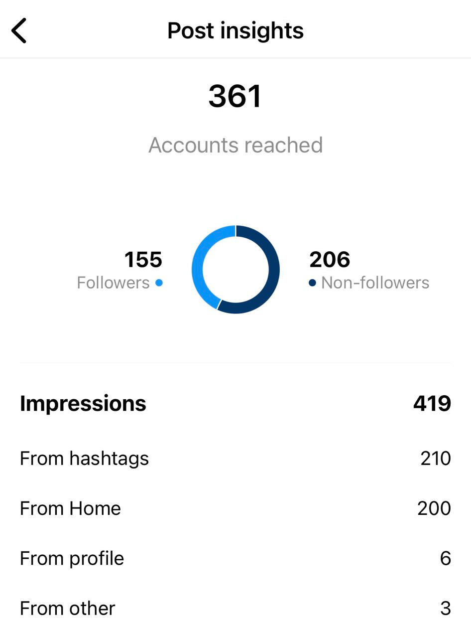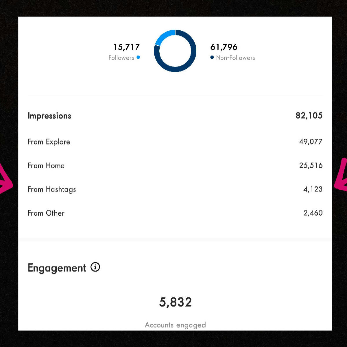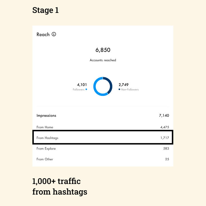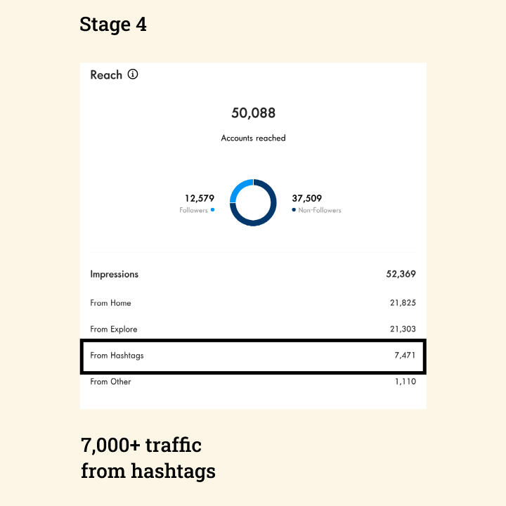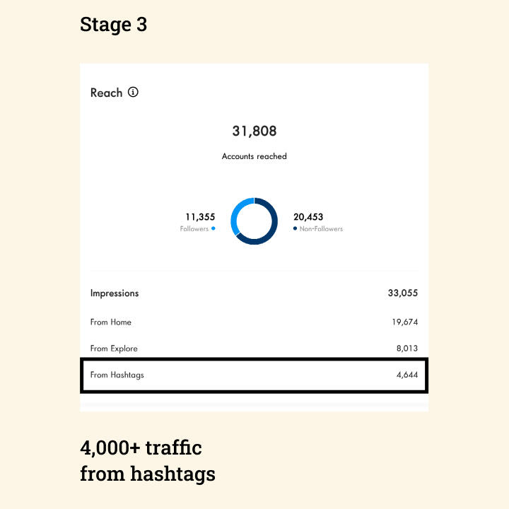 Iterate frequently to find stable sets of hashtags that fetch you significant traffic (usually close to 50% of your total traffic). After finding those sets, you alternate and repeat them for all subsequent posts. You don't have to find newer hashtags again.When starting out, getting traffic that is similar to the image below is a good signal. As you keep repeating those same hashtags, the traffic will build up into the 1000s.